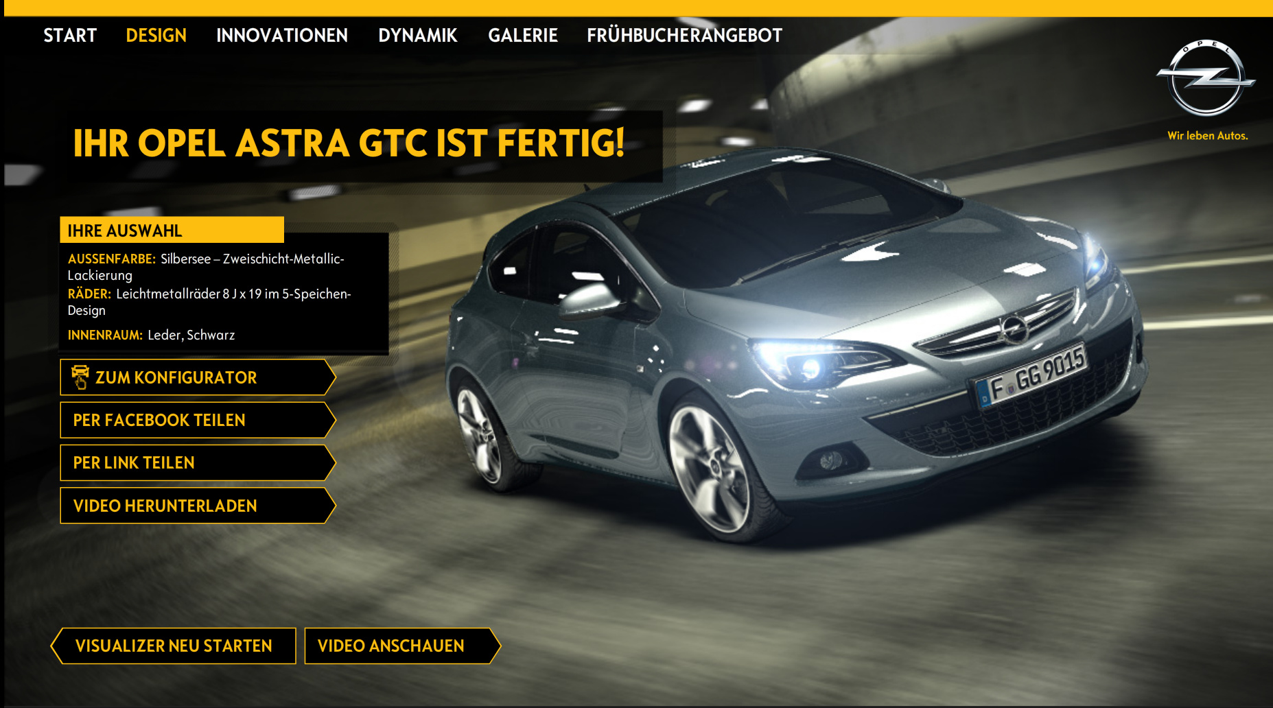Am Ende hat der User so ein Video mit seinem individuell konfigurierten Opel Astra GTC und kann den selbst konfigurierten Film downloaden oder ihn auf Social-Media-Plattformen sharen. Die Konfiguration während der Fahrt wird durch den „virtuellen Visualizer“ ermöglicht, den MRM worldwide realisiert hat. DDD hat mit Hilfe der von Impossible Software entwickelten Echtzeit-Videotechnologie die individuelle Videoerstellung übernommen.