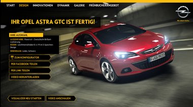 Vor der Produkteinführung des neuen Opel Astra GTC wird ein Konfigurator gewünscht, der das Fahrzeug während der Fahrt verändern kann und dies in einem laufenden Film zeigt. Der User soll sich auf diese Weise schon vor Verkaufsstart sein Traumauto virtuell zusammenstellen und es in Aktion sehen können.