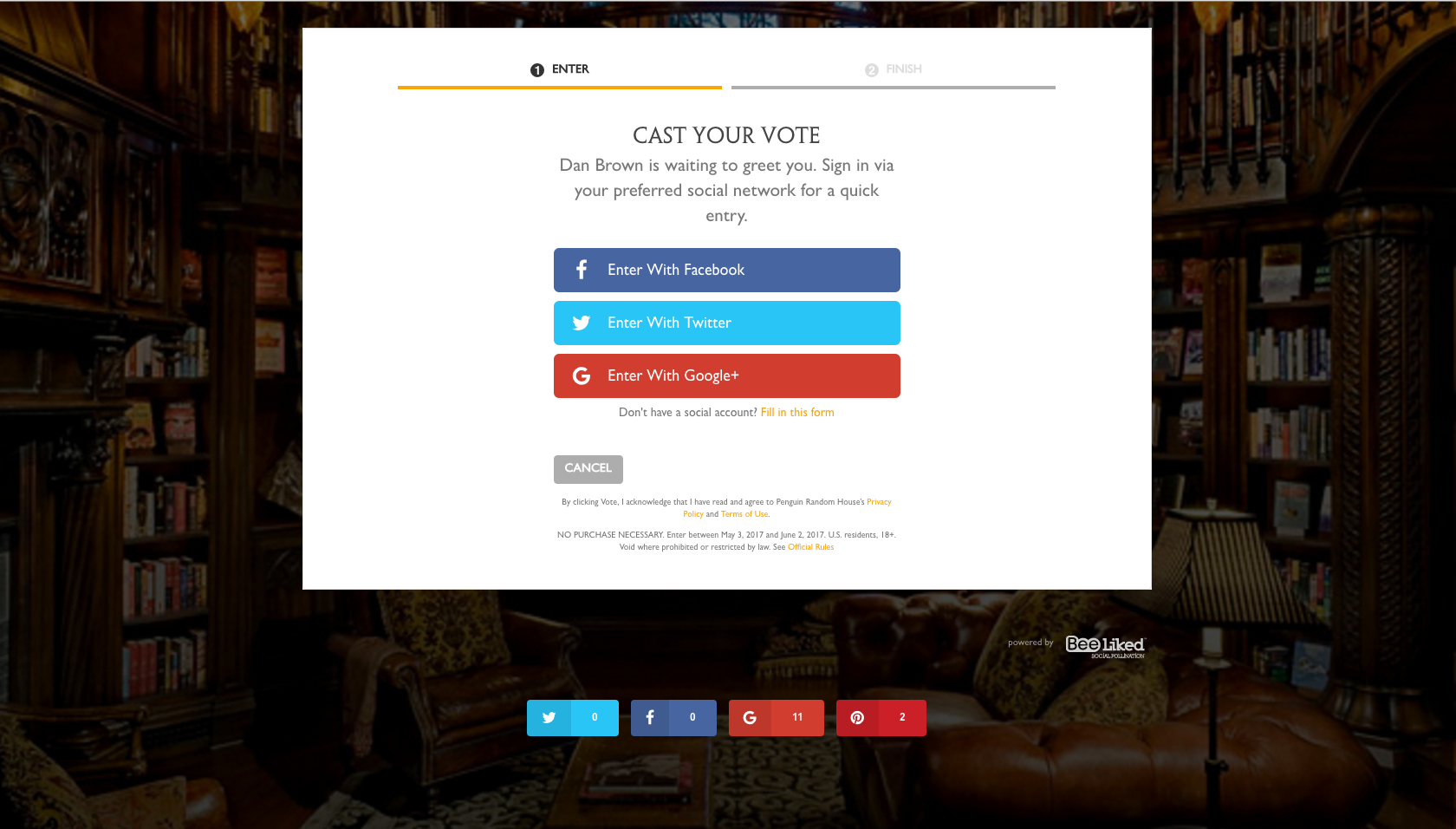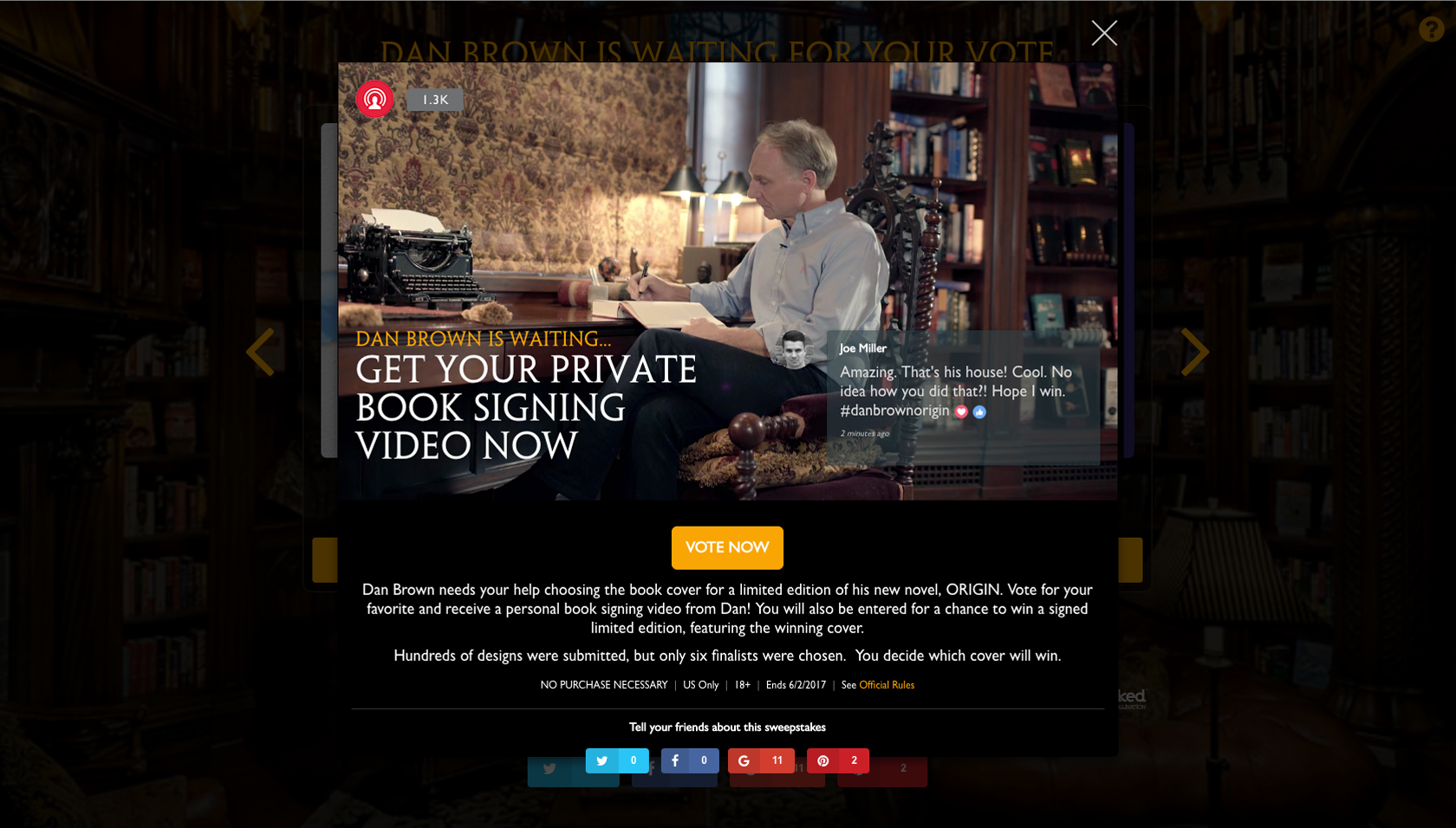 Für das neue Buch des ‘Da-Vinci-Code’ Autor Dan Brown sollte in der Zeit von Mai bis Juni 2017 ein Cover-Voting und gleichzeitigem Gewinnspiel veranstaltet werden. Der Teilnehmer dieses Gewinnspiels konnte eines von sechs Buchcovern auswählen und erhielt dann ein persönliches Video.