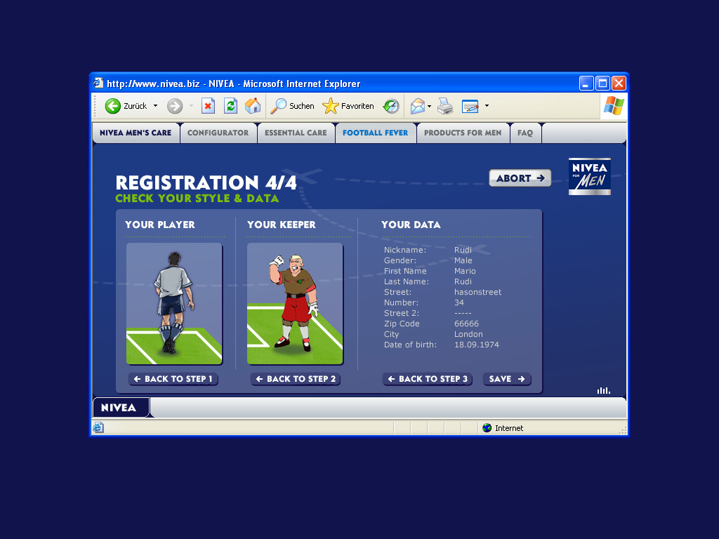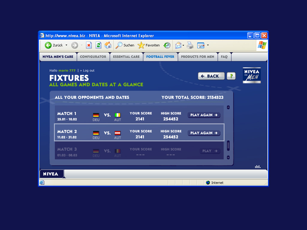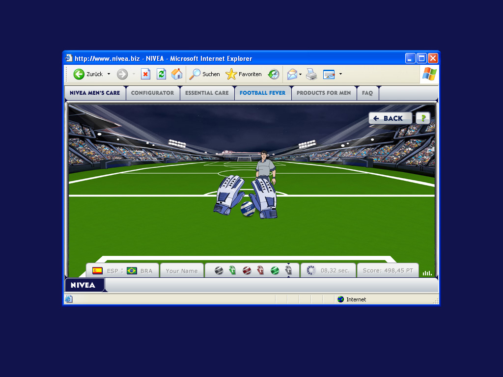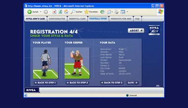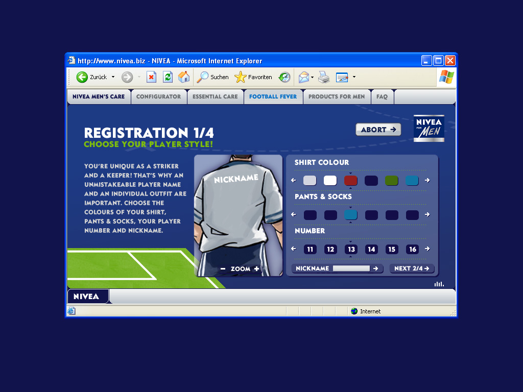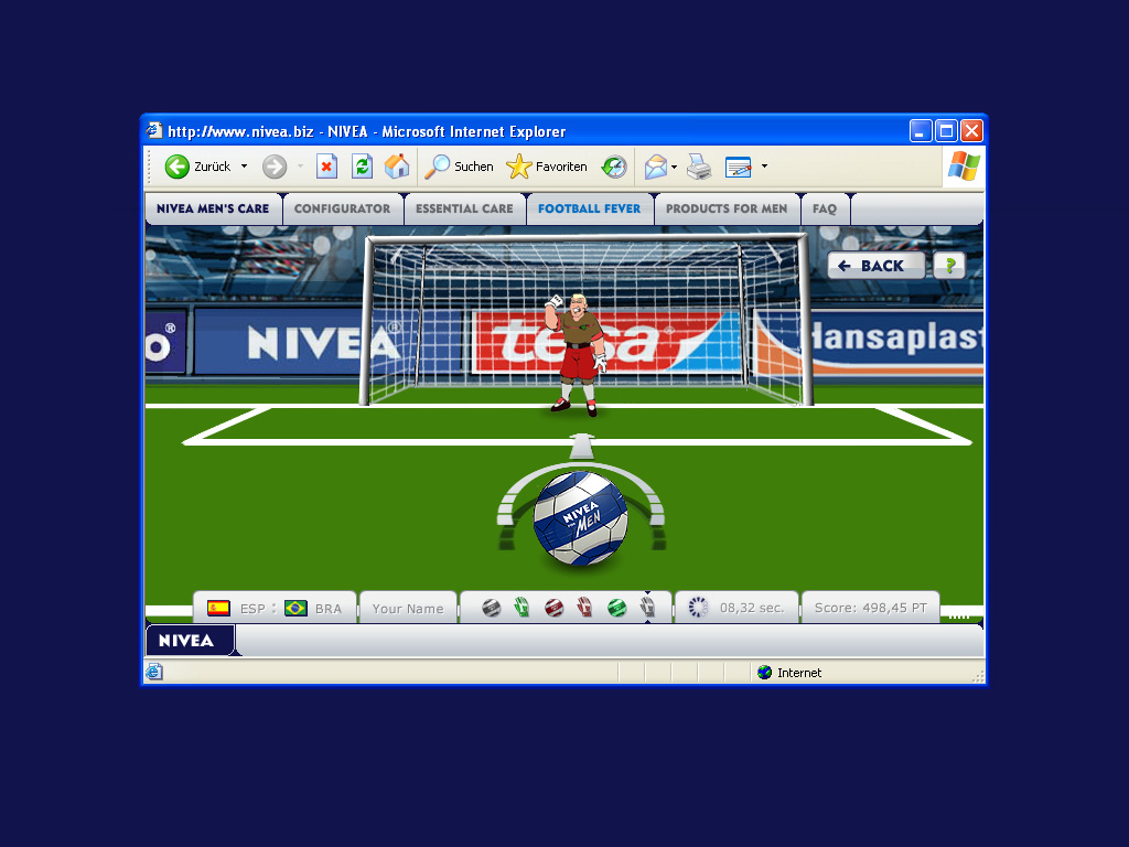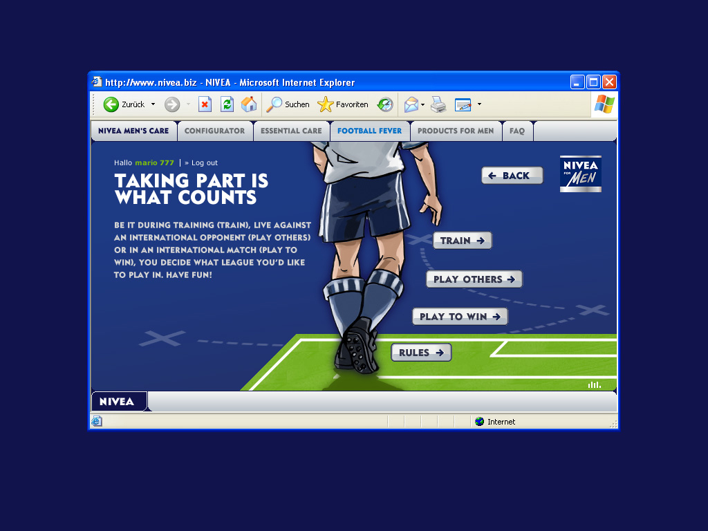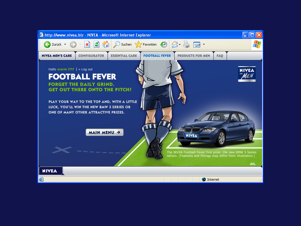 Anlässlich der Fußballweltmeisterschaft 2006 soll ein Online-Spiel entwickelt werden, bei dem „virtuelle Gegner“ spontan oder nach Spielplan gegeneinander antreten können. Das „NIVEA Football Fever“ soll in XX Ländern national und global gespielt werden. Neben den Partien, bei denen es ums Weiterkommen geht, sollen die User auch in ein Trainingslager gehen können, um sich für entscheidende Begegnungen fit zu machen oder einfach nur Spaß zu haben. Der Hauptpreis ist ein BMW 3er, außerdem gibt es jede Menge tolle Preise aus der Serie NIVEA for Men zu gewinnen.