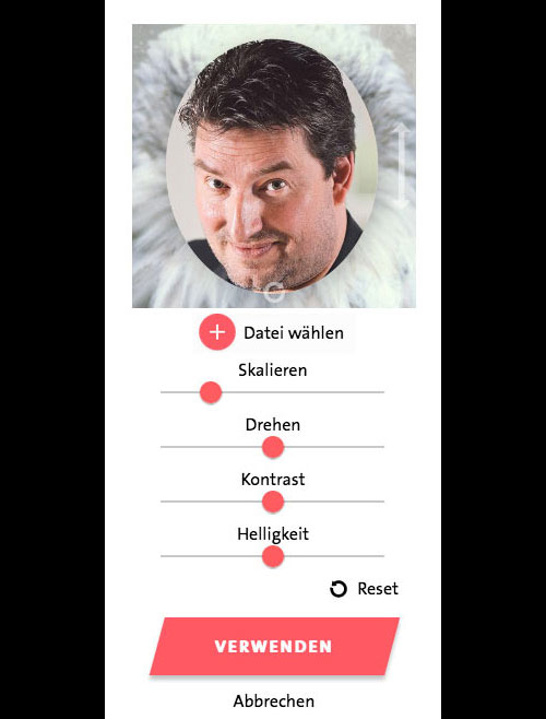 Möchte der User ein Foto in seinem COSMO-Clip verwenden, so hat er hier die Möglichkeit dazu. Mobile kann er ein Foto aufnehmen oder aus einem Album wählen. In der Desktop Variante steht ein Datei-Upload zur Verfügung. Das Foto kann durch Skalierung, Drehung, Kontrast und Helligkeit angepasst werden damit es in die vorgegebene Maske passt. Diese Funktionen wurden jeweils für Mobile und Desktop User optimiert. Das Foto wird im Clip selbst von dem jeweiligen Charakter als eine Maske vor das Tiergesicht gehalten.