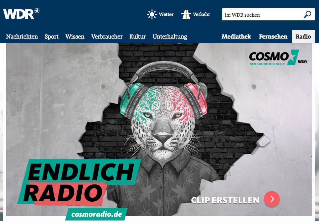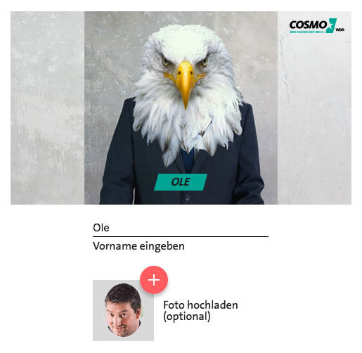Der Radiosender „COSMO“, der vom WDR, Radio Bremen und rbb gemeinsam produziert wird, möchte sein Markenimage mit dynamischen COSMO-Clips kommunizieren und so auf sich aufmerksam machen. Der User soll die Möglichkeit haben einen tierischen Charakter auszuwählen, diesen mit Namen und wahlweise mit oder ohne Foto zu personalisieren. Vier kurze Audioclips sollten zur Auswahl stehen, um den eigenen WDR COSMO-Clip mit der passenden Musik zu unterlegen. Anschließend soll der User sein Video ansehen, herunterladen, teilen und verschicken können.