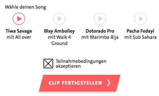 Bei der Song-Auswahl kann sich der User aus vier verschiedenen Stilrichtungen einen Song auswählen zu dem sein tierischer Charakter tanzen wird. Alle Songs haben den gleiche Geschwindigkeit damit sich die Tiere im fertigen Clip immer im richtigen Rhythmus bewegen.