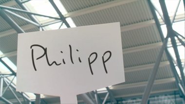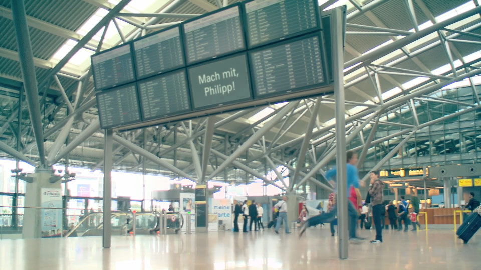 To prevent this, everybody involved in the first try starts to invite their colleagues to take part to finally form a complete T. For this all channels are used, be it by mobile phone, through name signs or messages on airport information boards. All these channels are individualized and show the name of the addressed Telekom-employee in the video.