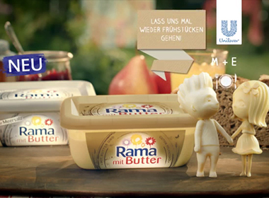 At the end of the spot he finally finds his luck in Miss Margarine who is also lonely. The connection is perfect: butter and margarine, like the new Rama with butter.