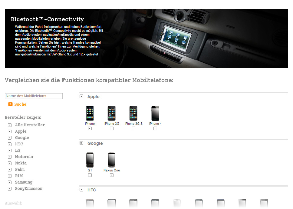 By using the bluetooth service tool, internally called "Bluetooth Connectivity" by smart, users are able to select their mobile device(s) from a database of compatible devices and research the available range of functionality.